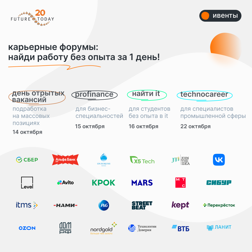- День открытых вакансий и подработок, 14 октября: https://careerday.fut.ru/vacancyday?utm_source=vuz&utm_medium=rec&utm_campaign=fa&utm_content=career&utm_term=fut_paid